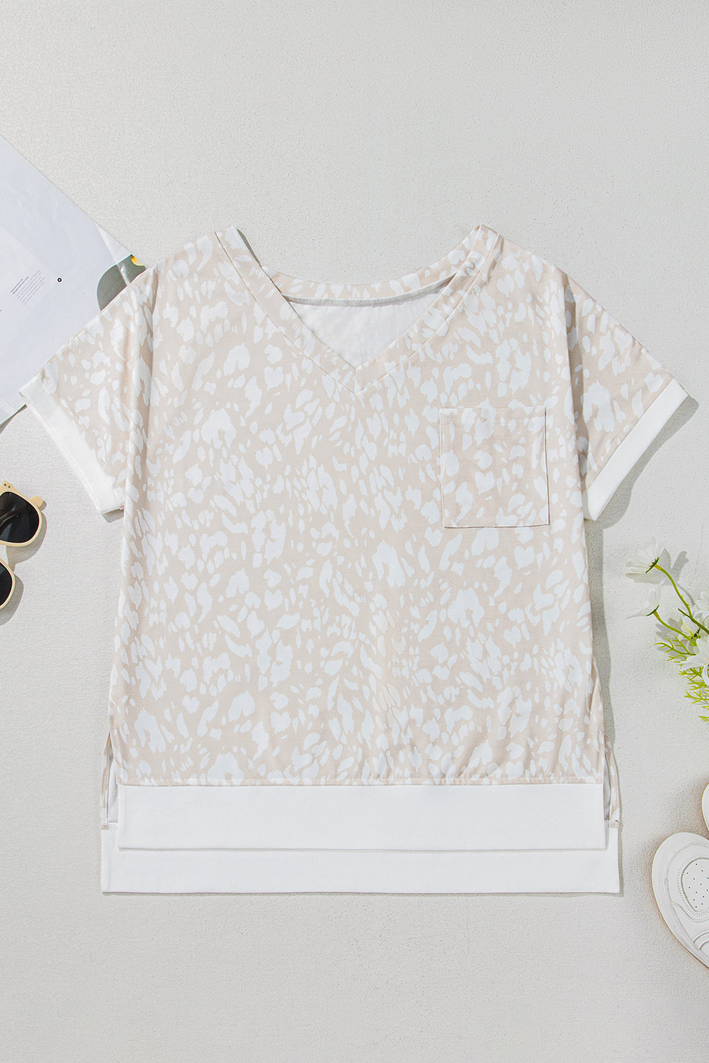 • This chic tee features a bold leopard print with a V-neckline and side slits.